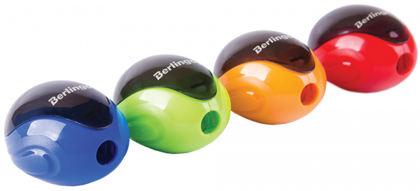 Temperówka o ergonomicznym kształcie z kolorowym plastikowym pojemnikiem na ostrużyny.