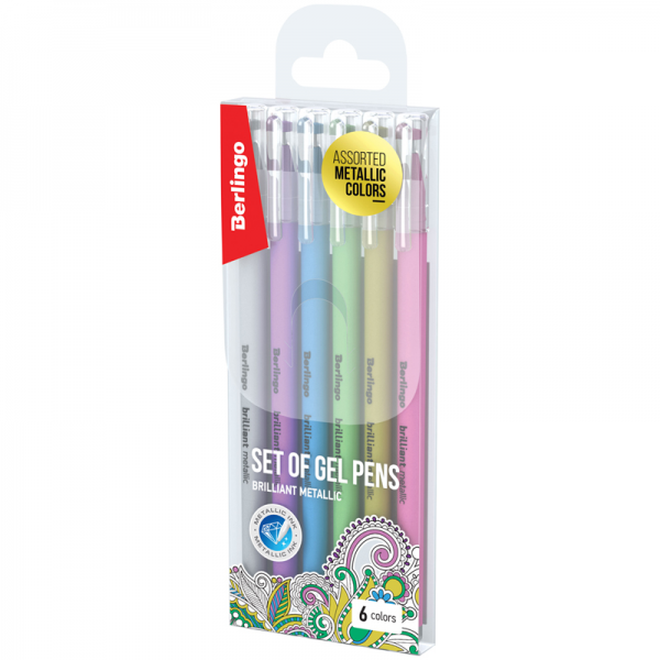 Zestaw żelowych długopisów Berlingo Brilliant Metallic w 6 metalicznych kolorach (złoty, srebrny, zielony, różowy, niebieski, fioletowy).