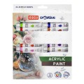 Zestaw zawiera 24 kolory farb akrylowych o pojemności 12 ml. Farby akrylowe posiadają żywe i czyste barwy. Służą do edukacji plastycznej dzieci i młodzieży oraz do wykorzystania w profesjonalnych pracowniach artystów plastyków. Łatwe w użyciu oraz zmywaniu ze skóry.
