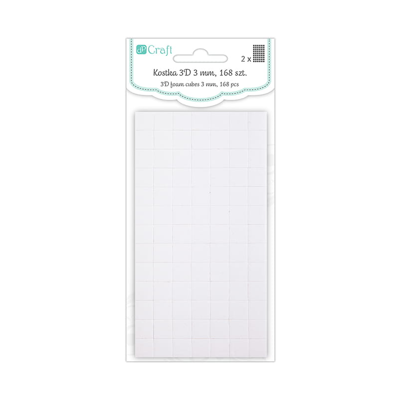 Przestrzenna taśma dwustronnie klejąca w formie kosteczek. Ułatwia mocowanie niewielkich elementów dekoracyjnych zarówno papierowych jak i z innych tworzyw, np. kryształków, kwiatków itp. Niezbędna do tworzenia przestrzennego efektu w kartkach okolicznościowych, scrapbookingu oraz innych projektach kreatywnych. Ilość w opakowaniu: 168 kostek (2 arkusze) Grubość: 3 mm Rozmiar 1 kostki: 1 cm x 1 cm