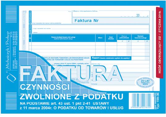 Faktura czynności zwolnione z podatku na podstawie art. 43 ust. 2-41 ustawy z 11 marca 2004r O PODATKU OD TOWARÓW I USŁUG A5 Typ 198-3E to druk wykonany z papieru samokopiującego (oryginał + kopia). Druk składa się z 80 kartek.