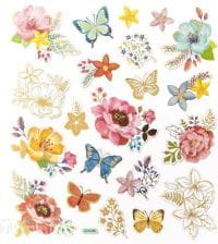 Arkusz kolorowych naklejek z motywem kolorowych motyli i kwiatów. Doskonałe do zdobienia projektów scrapbookingowych, kartek okolicznościowych, pakowania prezentów, a także do wszelkiego rodzaju dziecięcej aktywności twórczej.
