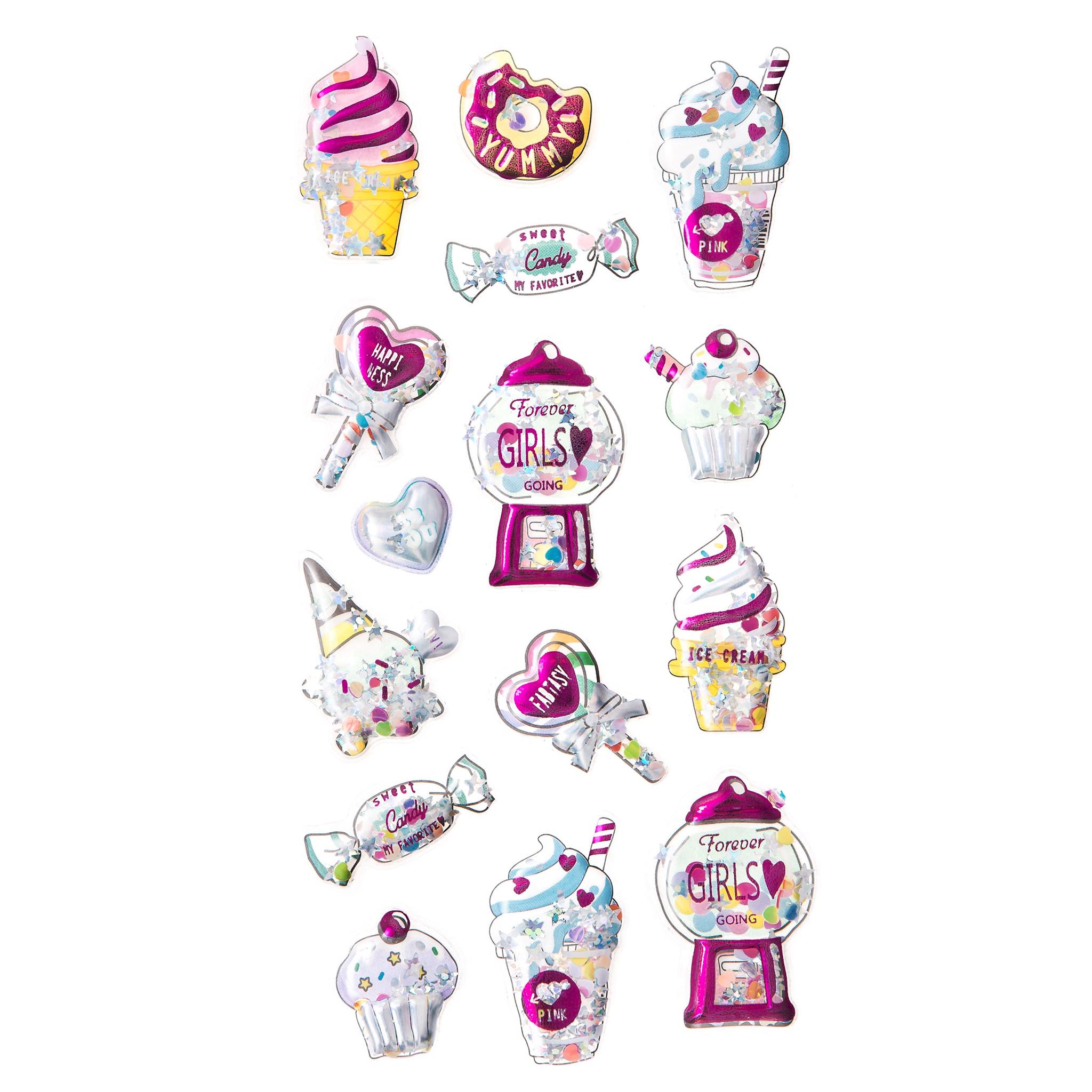 Naklejki shaker 3D z rozmaitych słodkości takich jak lody, lizaki i cukierki to absolutny HIT, doskonały do zdobienia, albumów kartek okolicznościowych, zaproszeń czy też opakowań prezentowych. Każda naklejka ma wypukłą, przezroczystą kopułkę i wypełniona jest kolorowym, opalizującym konfetti w kształtach serduszek i, gwiazdek. Naklejki te będą idealnym wykończeniem projektów urodzinowych takich jak zaproszenia czy kartki z życzeniami. Sprawdzą się również przy kreatywnej zabawie z dziećmi. Wybierając naklejki shaker z pewnością uzyskasz efekt WOW na swoich pracach. Liczba naklejek w opakowaniu: 15 szt. Wielkość blistra: 9 x 17,5 cm Wielkość naklejek: od 1,5 x 1,5 cm do 4 x 2,8 cm Cechy szczególne: naklejki 3D z przezroczystymi kopułkami wypełnionymi konfetti.