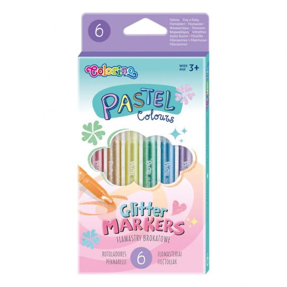 Flamastry brokatowe w 6 pastelowych kolorach.