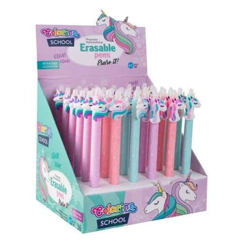 Automatyczny długopis wymazywalny z Jednorożcem wyposażony jest we wkład o grubości linii pisania równej 0,5mm. Zastosowany tusz jest odporny na wodę, blaknięcie jak również inne czynniki atmosferyczne. Można go zmazać przy użyciu gumeczki na końcu długopisu. Wysunięcie części piszącej następuje po naciśnięciu główki wybranego bohatera.