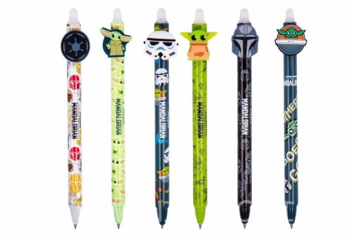 Automatyczny długopis wymazywalny z motywem star wars wyposażony jest we wkład o grubości linii pisania równej 0,5mm. Zastosowany tusz jest odporny na wodę, blaknięcie jak również inne czynniki atmosferyczne. Można go zmazać przy użyciu gumeczki na końcu długopisu. Wysunięcie części piszącej następuje po naciśnięciu główki motywu star wars.