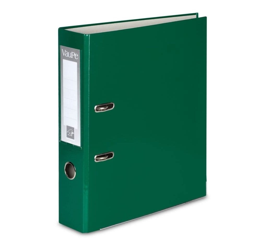Segregator wykonany z twardej, 2 mm tektury; oklejka kolorowa - pokryta folią polipropylenową; wyklejka papierowa; mechanizm dźwigniowy z dociskiem, grzbiet o szerokości 75 mm; oczko grzbietowe; wymienna etykieta do opisu.