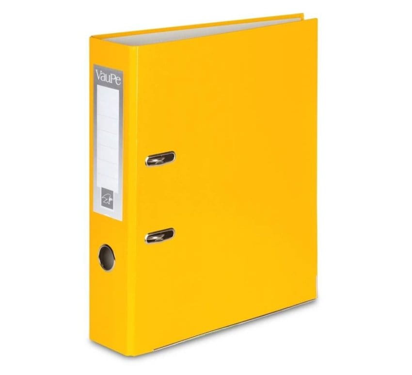 Segregator wykonany z twardej, 2 mm tektury; oklejka kolorowa - pokryta folią polipropylenową; wyklejka papierowa; mechanizm dźwigniowy z dociskiem, grzbiet o szerokości 75 mm; oczko grzbietowe; wymienna etykieta do opisu.