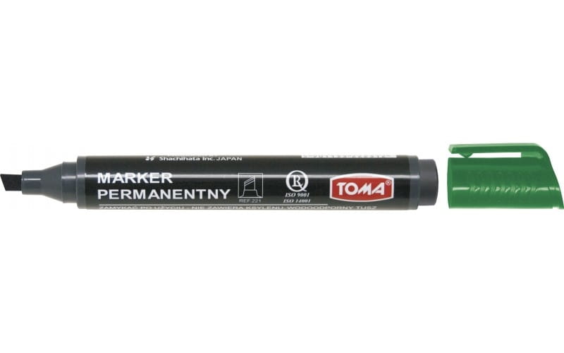Marker permanentny z tuszem wodoodpornym, który nie zawiera ksylenu i toluenu, do pisania po wszystkich powierzchniach, certyfikaty : ISO 9001, ISO 14001, japońska technologia i produkcja, końcówka ścięta 1-5 mm, linia pisania 300 m.