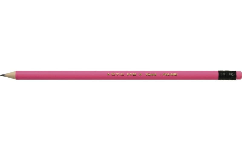 Kolorowy ołówek STIC, z żywicy syntetycznej z gumką, elastyczny, odporny na złamania, grafit HB, wyjątkowo trwały i miękko piszący. Dostępne kolory: czerwony, zielony, pomarańczowy, różowy, niebieski. Dostępne opakowania: pudełko 12 szt. mix kolorów
